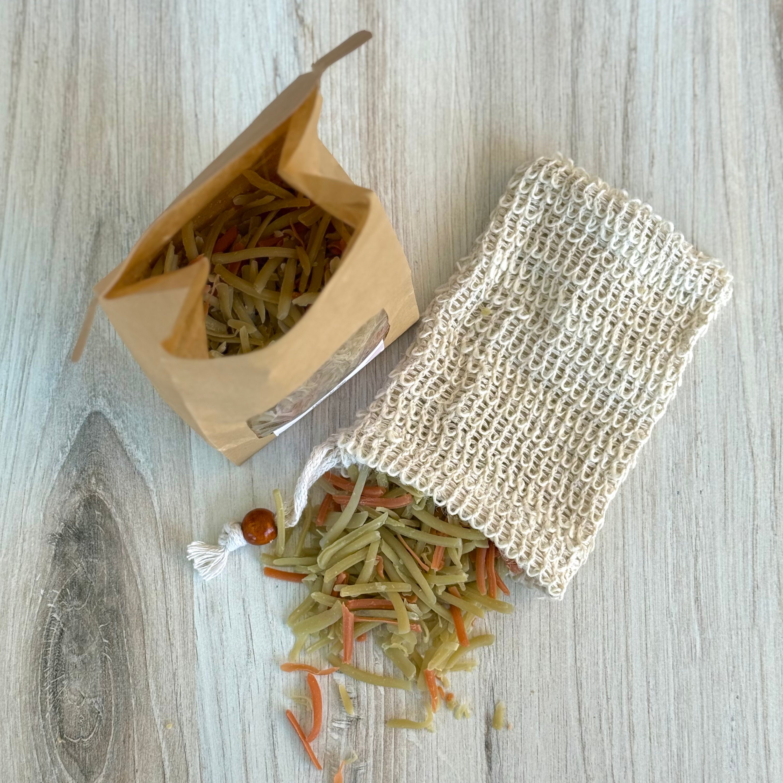 Scoop, refill, and lather - it's that simple. Eco Suds is a gentle blend of goat milk soap shreds designed for easy, sustainable bathing. Add as much as you need to your sisal soap bag, then enjoy a creamy aromatic lather that leaves skin soft and refreshed. Scented with lavender, cedarwood, and orange essential oils, this calming, woodsy-citrus blend turns everyday washing into a small act of care for both you and the planet. A sisal bag is included in this eco-friendly package.