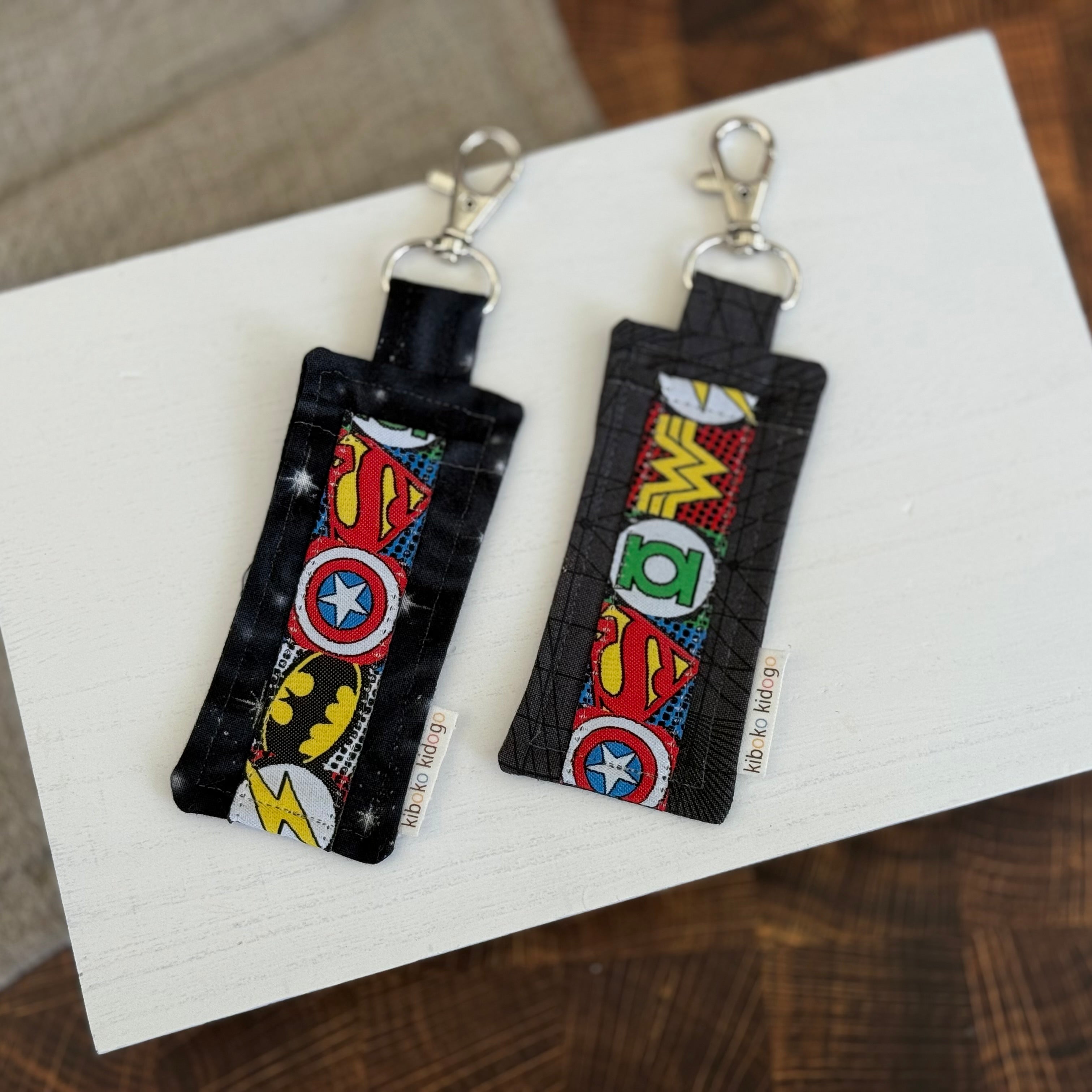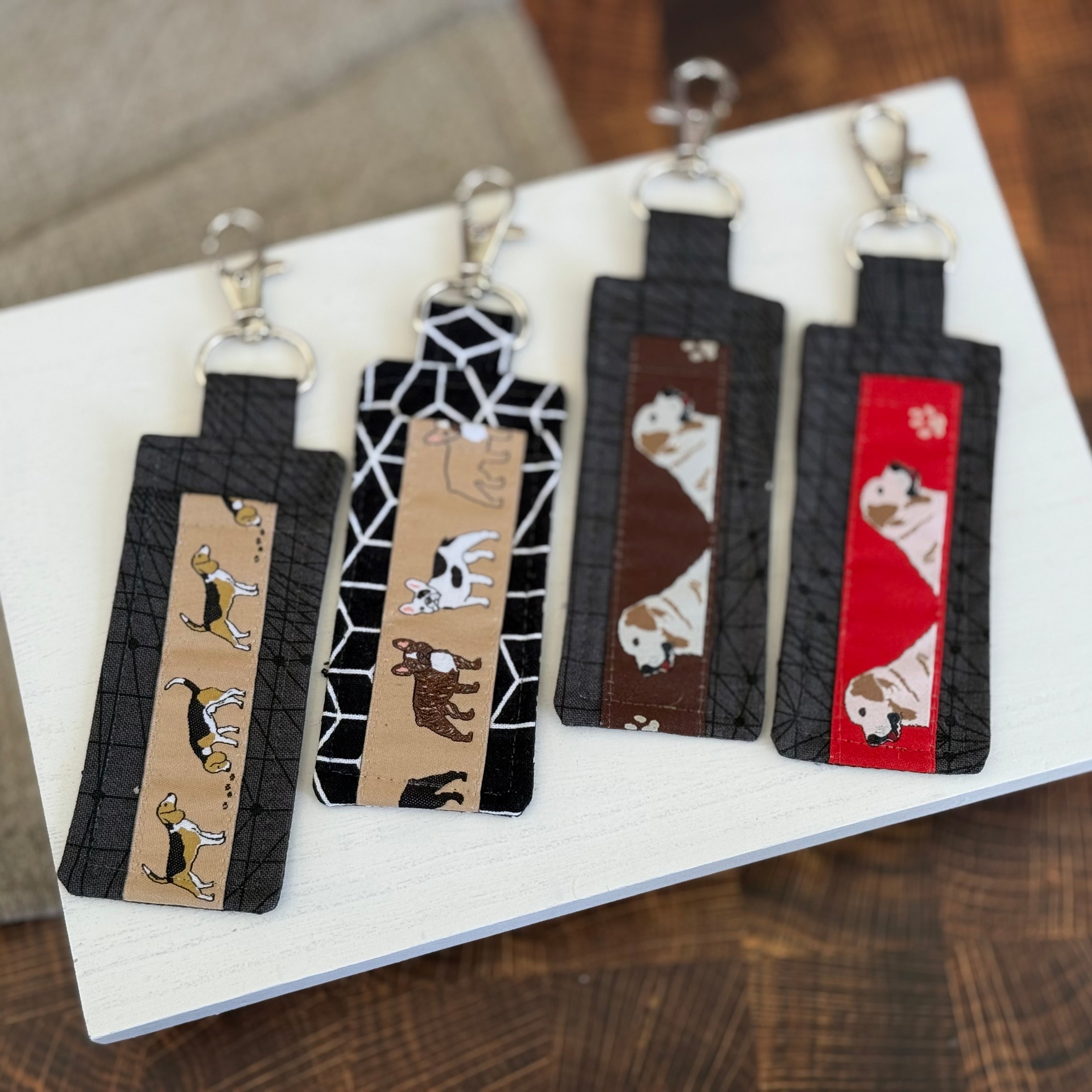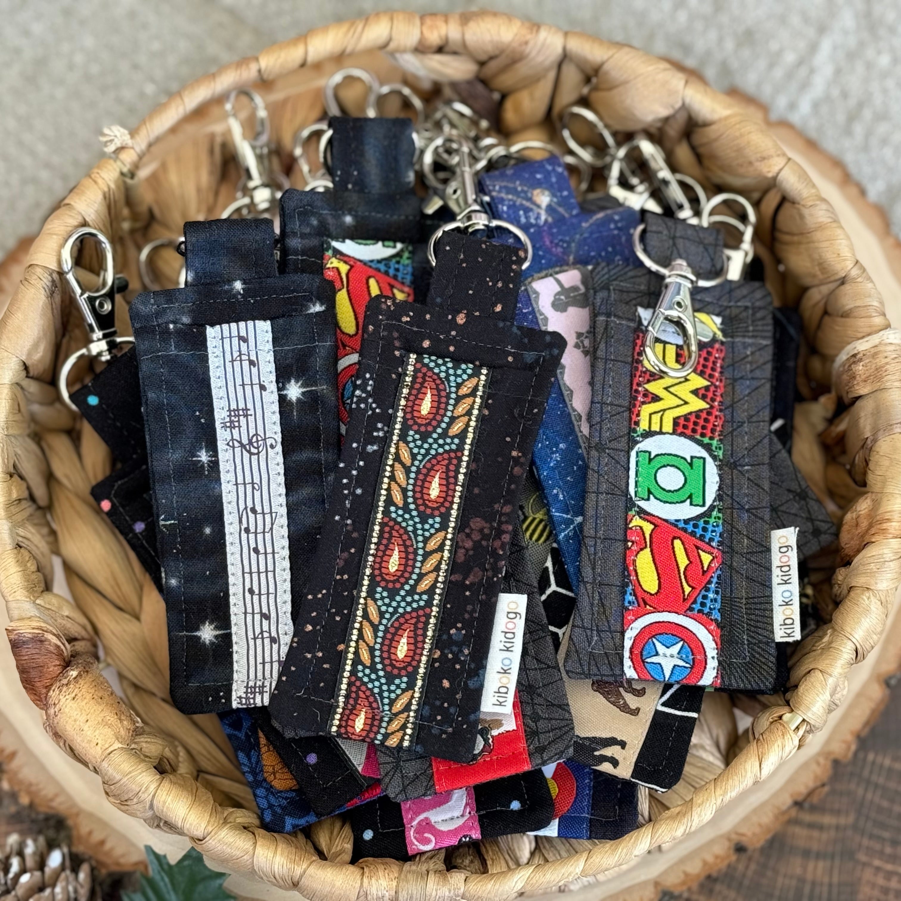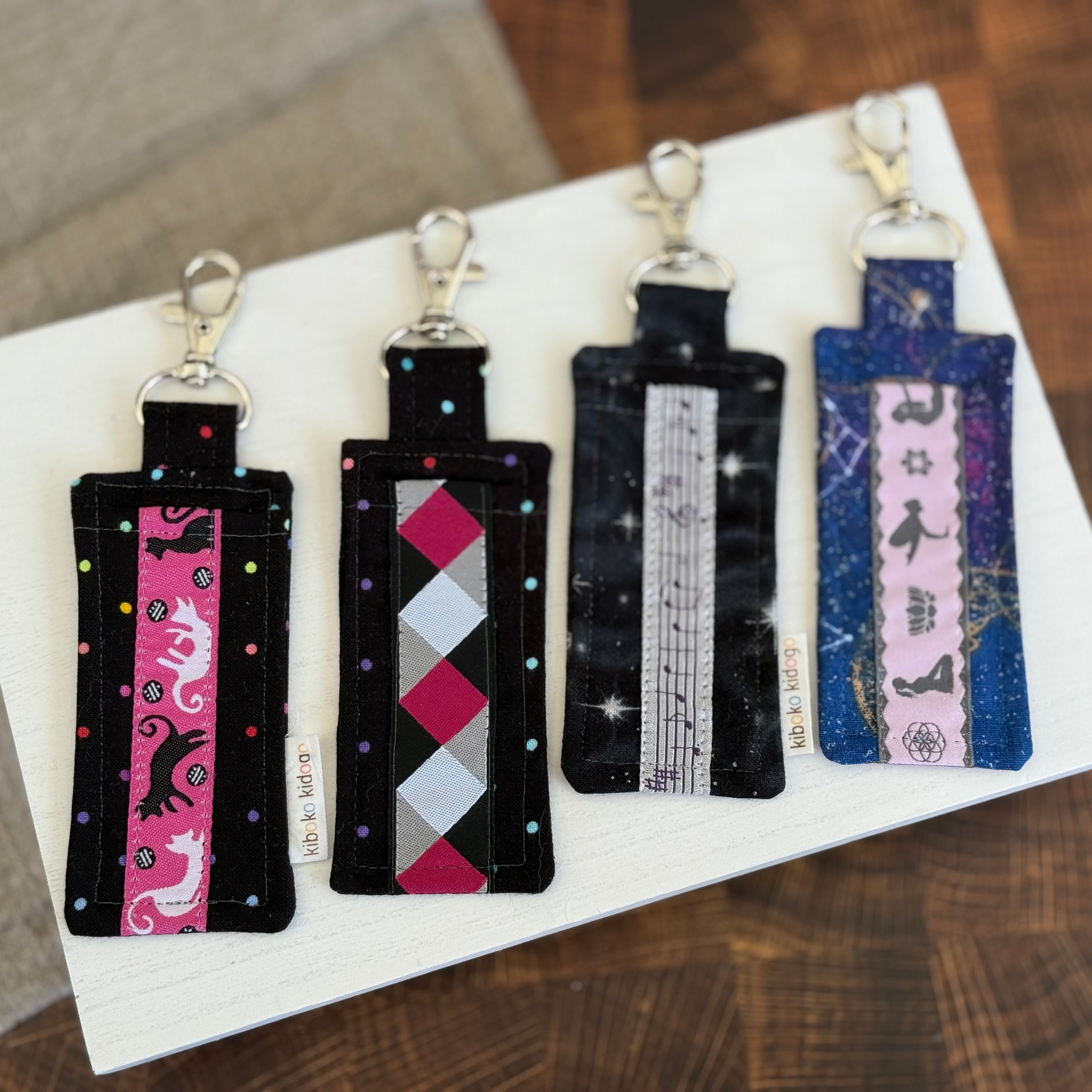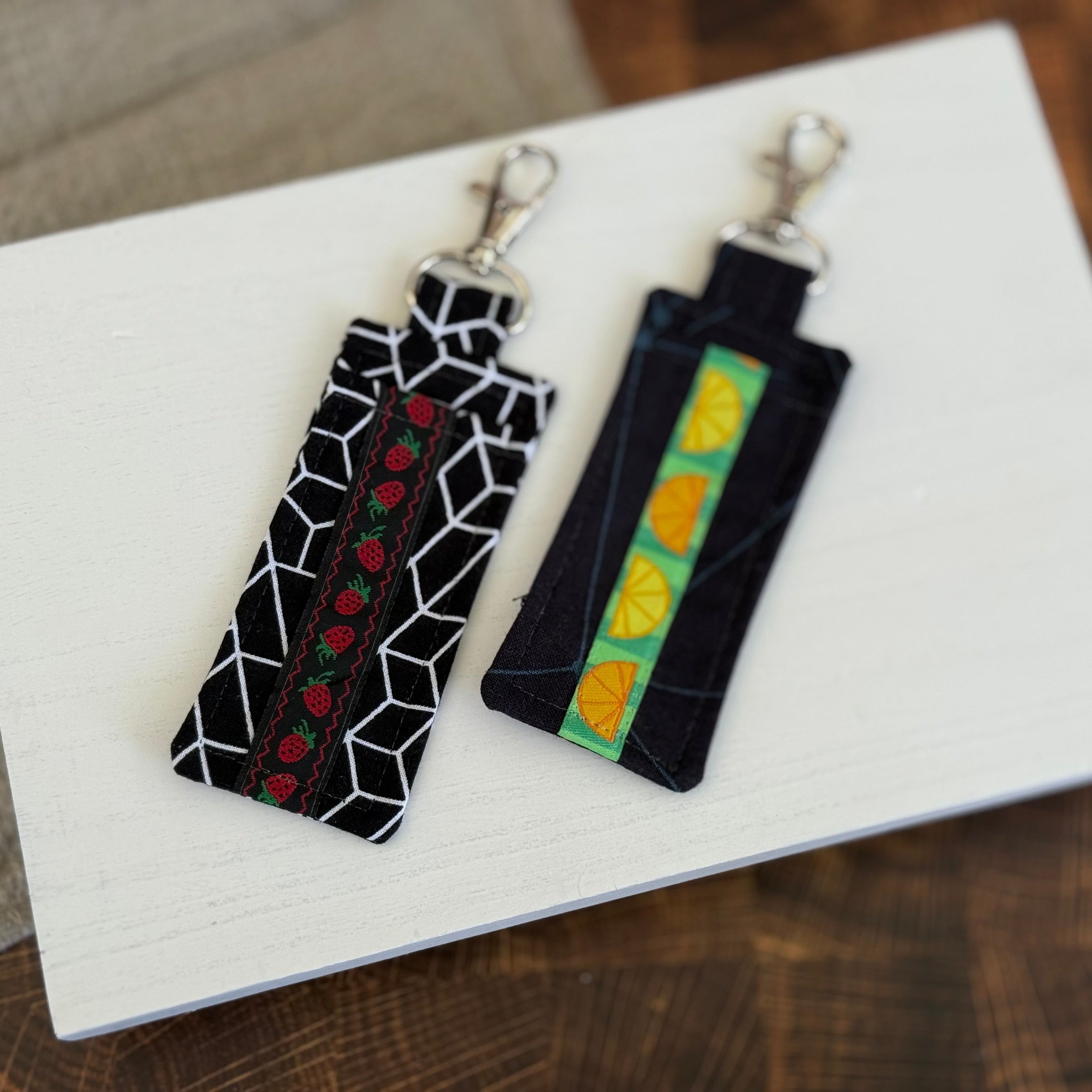 Keep your lip balm close and easy to find with this charming keychain pouch - the perfect blend of function and style. Each pouch is handmade with soft cotton fabric and finished with a jacquard ribbon accent, adding a touch of texture and personality. A sturdy snap hook lets you clip it to your keys, bag, or backpack so your lip balm is always within reach. Compact, durable, and thoughtfully designed, its the little accessory you'll never want to leave home without - because hydrated lips should always travel in style. Pair it with your favorite EJ's Farm-Crafted lip balm.